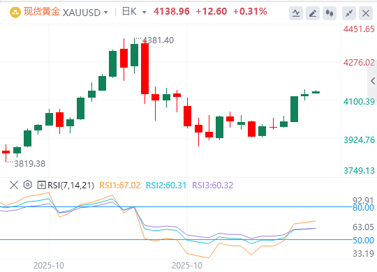 技术面:从黄金日线图来看,黄金的技术面依然看涨,但上涨趋势停滞,目前形成十字星形态,表明买卖双方力量均不占主导地位。从动量角度来看,相对强弱指数(RSI)显示金价仍有进一步上涨空间。如果金价突破4160美元/盎司,下一个阻力位将是10月22日的高点4161美元/盎司,之后是4200美元/盎司。