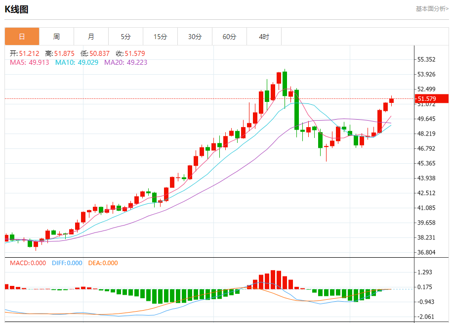 现货白银:截止北京时间21:20,现货白银上涨,现报51.556,涨幅0.71%。纽市盘前,(白银)价格在最后一个交易日扩大了涨幅,突破了当前51.25美元的阻力位,利用了来自EMA50上方交易的积极支持,除了相对强度指标出现积极信号之外,尽管达到了超买水平,但短期内还出现了小幅看涨趋势线。
