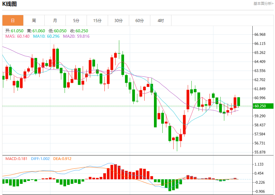 原油市场:截止北京时间21:20,美油下跌,现报60.240,跌幅1.29%。纽市盘前,(原油)价格在最后一个盘中交易中下跌,试图获得可能有助于其恢复和再次上涨的看涨势头,并试图在相对强度指标上卸载一些超买条件,从依靠其EMA50的支撑开始,在短期基础上的主要看涨修正趋势占主导地位,并沿着该轨道的支撑趋势线交易。
