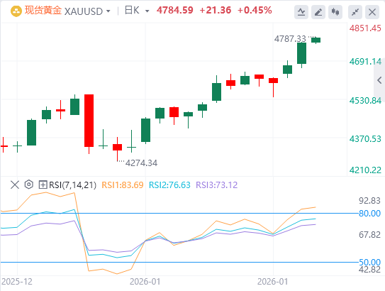 技术面:多头正瞄准4800美元/盎司关口。尽管金价创下更高的高点和更高的低点,但相对强弱指数(RSI)持续显示涨势过度,已进入超买区域,但未能突破近期高点。如果金价突破4800美元/盎司,下一个阻力位将是4900美元/盎司,之后是5000美元/盎司重要关口。反之,如果金价跌破4700美元/盎司,第一个支撑位将是4600美元/盎司,随后是1月16日的低点4536美元/盎司。