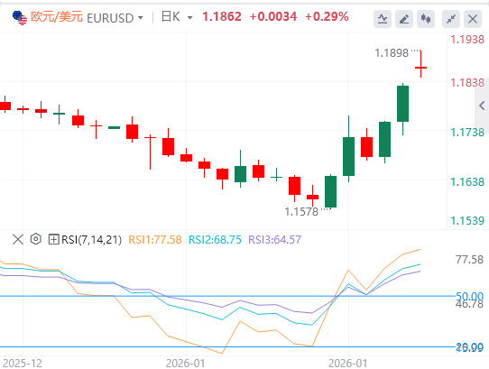 技术面:日线相对强弱指数(RSI)已升至80附近,黄金价格突破了运行约两个月的上升通道上轨,显示市场处于极度超买状态。因此,在趋势延续之前,金价不排除出现技术性修正。若金价有效突破5000美元,市场可能转向关注5100、5200、5300等整数关口附近的获利了结目标区域。