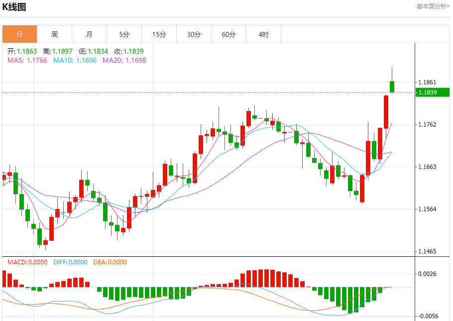 欧元/美元:截止北京时间21:20,欧元/美元上涨,现报1.1840,涨幅0.07%。纽市盘前,欧元兑美元的价格在最后一个交易日下跌,试图获得可能有助于其恢复和再次上涨的看涨势头,试图在相对强度指标上摆脱一些明显的超买状况,特别是在那里出现负面信号的情况下,在短期主要看涨趋势的主导下,在EMA50上方交易的持续积极支持下,其交易沿着陡峭的小趋势线进行,显示了该轨道的主导地位。