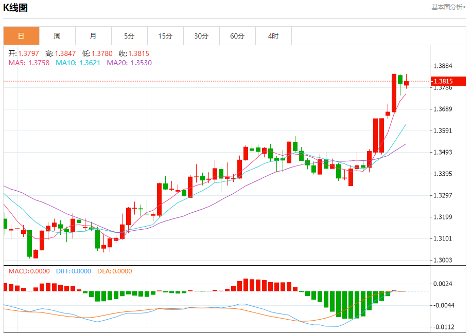 英镑/美元:截止北京时间21:20,英镑/美元上涨,现报1.3815,涨幅0.08%。纽市盘前,GBPUSD在盘中的最后一个交易中上涨,主要的短期看涨趋势占主导地位,由于其在EMA50上方的交易,动态压力持续,伴随着相对强度指标的积极信号的出现,在形成加强周围动力的积极背离之后。