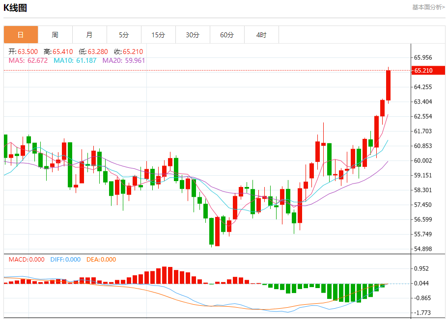 原油市场:截止北京时间21:20,美油上涨,现报65.180,涨幅3.12%。纽市盘前,(原油)价格在上一个盘中交易中扩大了涨幅,达到了我们之前分析的预期目标64.40美元阻力,在短期基础上主要看涨趋势占主导地位,由于其交易位于EMA50上方,除了来自相对强度指标的积极信号的出现,尽管达到了超买水平,这可能会减少即将到来的涨幅。