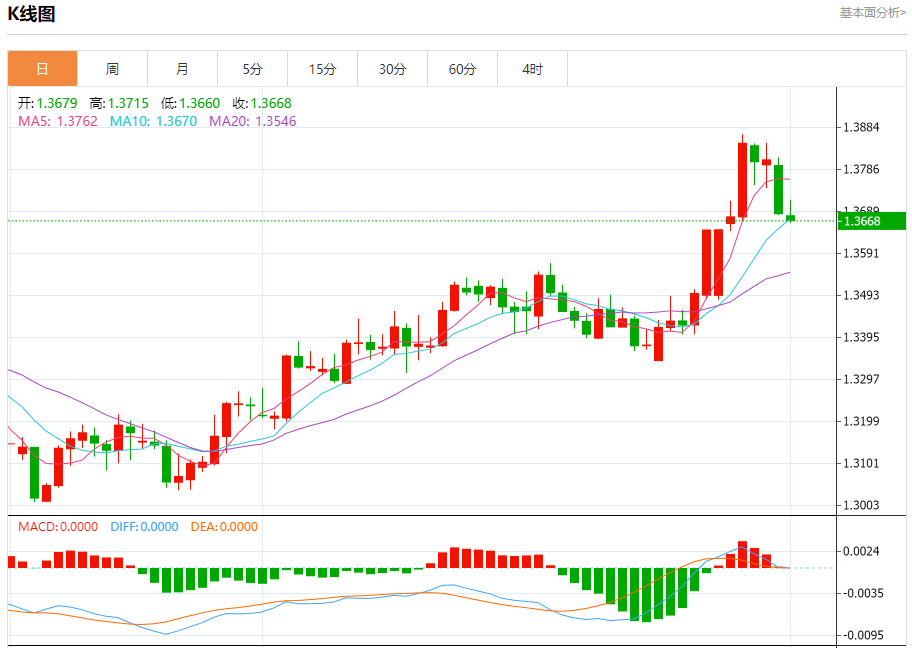 英镑/美元:截止北京时间21:20,英镑/美元下跌,现报1.3668,跌幅0.13%。纽市盘前,GBPUSD在盘中的最后一个交易中遭遇了一系列损失,试图寻找更高的低点,以此作为基础,帮助其获得复苏所需的看涨动力,从依靠EMA50的支持接近,从相对强弱指标中出现负面信号,另一方面,主要的看涨趋势在短期内仍占主导地位。
