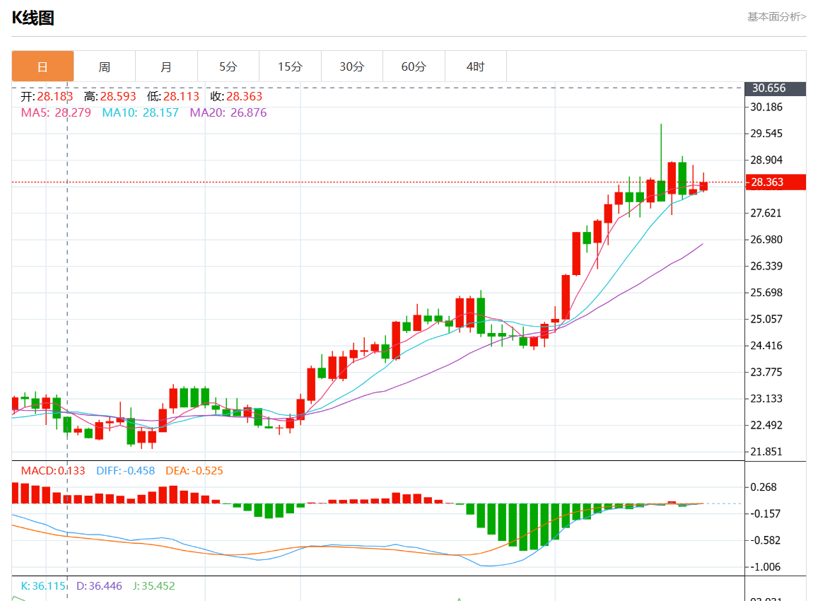 周二欧市盘中,现货白银报28.460,涨幅0.96%。