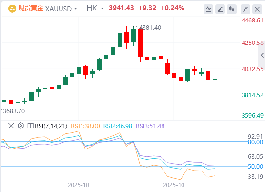 今日将公布美国10月ADP数据,市场预期2.5万人,而前值是-3.2万人,表明市场预期10月的就业数据有所好转,但美国政府停摆已经35天的背景下,数据能否符合预期甚至超过预期,有待观察。若10月ADP数据大幅不及预期,将坐实劳动力市场降温信号,12月降息概率或瞬间回升至80%以上,金价有望借机反弹;反之,若数据超预期,美元将继续高歌猛进,黄金恐再探3900美元整数关口。