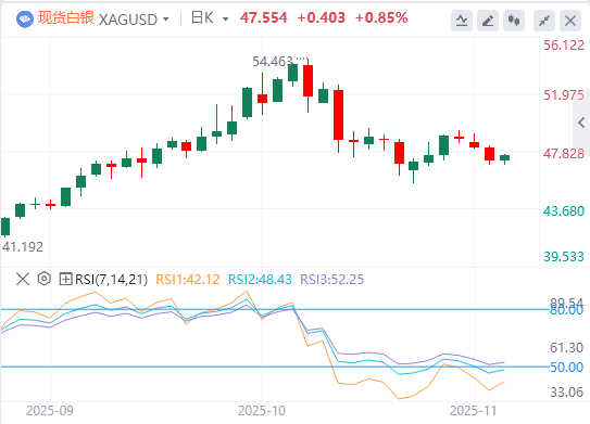 白银价格从高点54.38开始回落,形成一波完整的5浪下行,目前开启反弹,反弹在49.20附近承压,形成一个类似头肩底的形态,目前价格处于右肩位置,若在46.30附近获得支撑,则将再次反弹。均线上来看,白银目前围绕短期均线波动,形成平行缠绕,并未方向。下方的MACD指标形成背离,表明价格下跌暂缓,遇到支撑。日内保持低多的思路,回落46.70附近接多,注意控制风险。