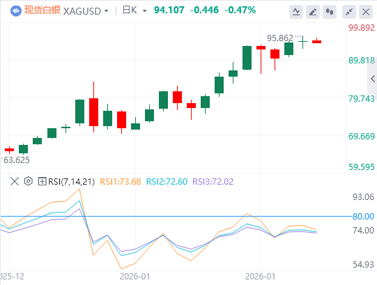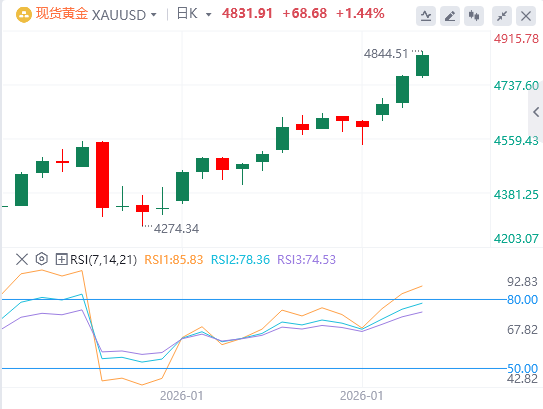 金价再创纪录高位,突破每盎司4700美元,因地缘政治紧张加剧推升避险需求;现货银亦首次突破95美元。现货金上涨1.9%,报每盎司4760.02美元。此前一度触及纪录高位4765.93美元附近。
