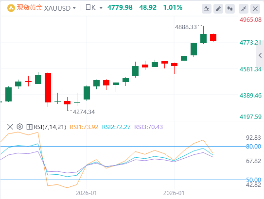 金价回吐部分涨幅,自纪录高位回落,此前美国总统特朗普收回了部分有关格陵兰的强硬威胁。现货金上涨1.53%,报每盎司4836.14美元,此前一度触及纪录高点4887.82美元附近。