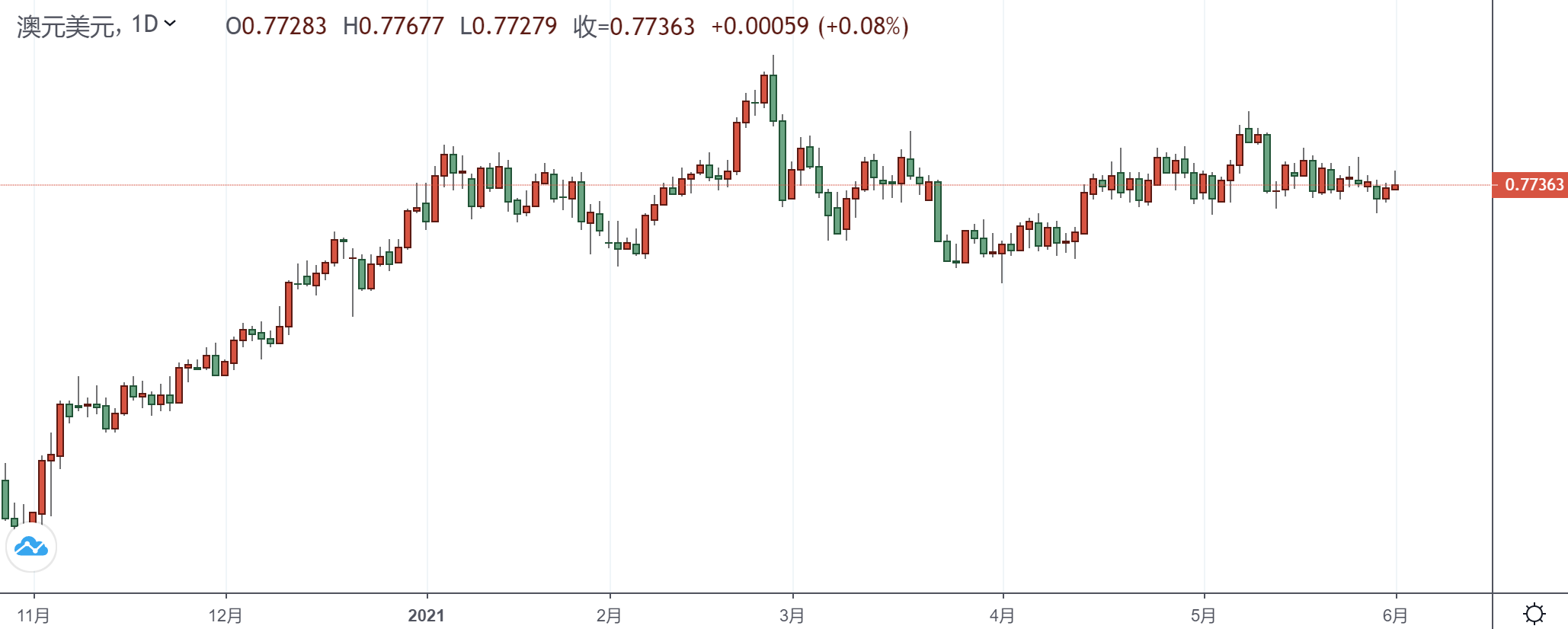 上方关注日高0.7768,若能突破这一水平可以上看5月26日高位0.7796,再往上关注61.8%回撤位0.7826。