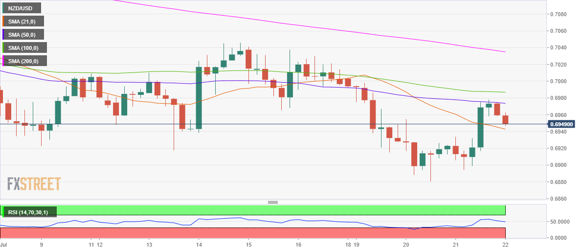 纽元兑美元的卖方周四回归,此前在0.6975区域附近出现了短暂逆转,出现了强劲阻力。 正如在四小时图表上观察到的那样,新西兰元正在南下测试向下倾斜的21-简单移动平均线(A),位于0.6942,未能在温和看跌的50-A(0.6973)上方找到接受区间。 相对强弱指数(RI)从上方穿过中线后,在上述时间框架内转为看跌。领先指标现在