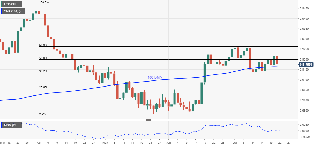 美元兑瑞郎仍在0.9175附近承压,尾盘震荡,周四欧洲市场开盘。 主要货币对从前一交易日的两周高位调转过来,收盘跌破4-6月下行的50%斐波那契回调(斐波那契水平)。 除了关键的斐波那契回调线被击穿,不要忘记在7月初无法跨越61.8%的斐波那契回调线,向下倾斜的动量线也对报价造成了压力。 然而,100日移动均线挑战了美