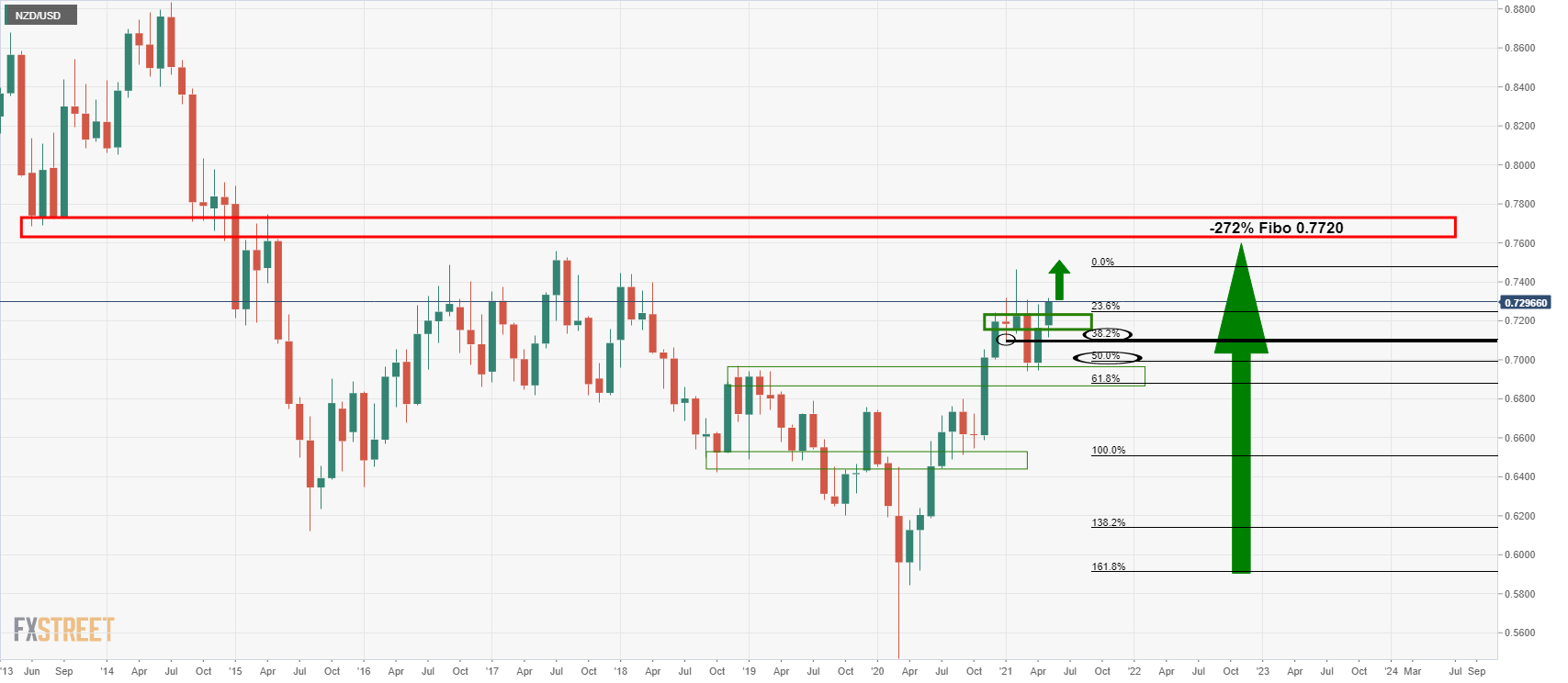 新西兰元令人疲累,尽管长期基本面可能累积,但近期的未来可能在这个关键时刻考验弱势投资者。 下面是对月线图和日线图的分析,它提供了在更高水平之前的短期修正前景,而小时线图显示了下行机会可能来自旧支撑结构的其他部分。 月线图 正如在之前的分析中指出的那样,基本面可以解读,“在之前的看涨冲动修正之后,