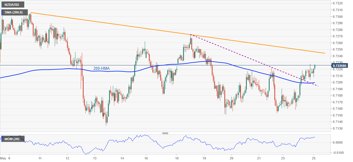 纽元兑美元延续了周一的乐观表现,周二早盘在0.7225附近出现买入价,盘中上涨0.25%。在此过程中,新西兰元对证明了200-HA的上行突破和5月18日开始的下降趋势线是合理的。 由于强劲的势头线有利于纽元兑美元的多头,纽元兑美元即将上涨至另一个趋势线阻力位0.7255附近。 不过,任何进一步的上行需要穿过0.7270,才能挑