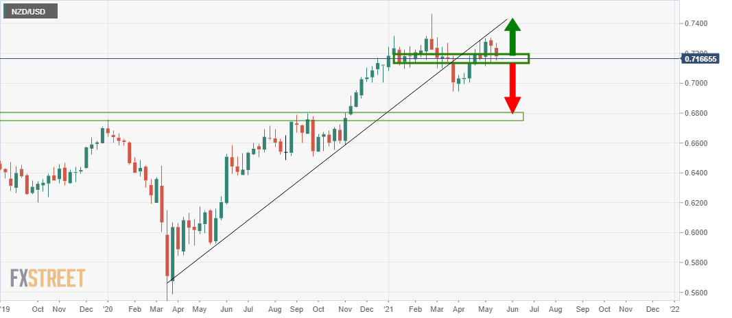 在动态支撑位被突破后,纽元兑美元正在测试周内的关键支撑位。动态支撑位现在充当了趋势线的反面。 下图展示了在日线图上,随着熊市的头和肩的汇合,下行突破的前景如下所示: 周线图 日线图 4小时图 从4小时的角度来看,纽元价格需要打破动态支撑以及水平。