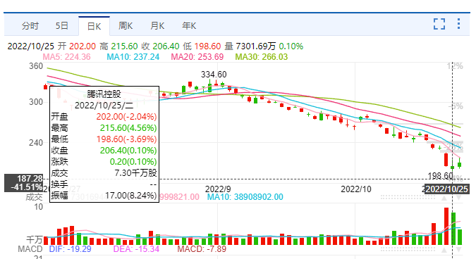 10ÔÂ25ÈÕÌÚѶ¿Ø¹ÉµÍ¿ªºóС·ùÕðµ´£¬Ò»¶ÈµøÆÆ200¸ÛÔª¹Ø¿Ú£¬ÏòÏ´¥¼°198.6¸ÛÔª£¬´´2017Äê3ÔÂÒÔÀ´Ðµͣ¬²»¹ý£¬ÊÕÅÌ·ºì£¬ÊÕÓÚ206.4¸ÛÔª/¹É£¬ÉÏÕÇ0.1%¡£