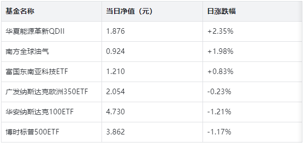 按投资方向划分,当日QDII基金净值表现呈现“能源强、欧美弱、新兴稳”的特征。能源主题基金成为最大赢家,华夏能源革新QDII净值上涨2.35%,收于1.876元,该基金重仓的埃克森美孚、雪佛龙当日分别上涨1.82%、2.17%,叠加国际油价突破64美元/桶关口,推动基金净值创近一个月新高。南方全球油气、易方达原油A人民币分别上涨1.98%、1.76%,净值分别报0.924元、1.132元,近一周累计涨幅均超5%。