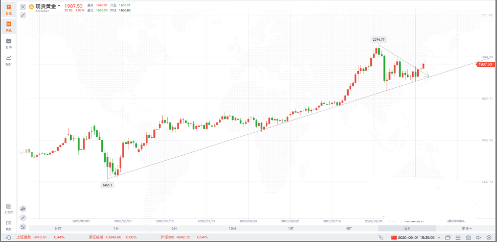 北京时间9月1日,欧盘盘初,现货黄金站上1990美元关口,较日低涨25美元,最高涨至1990.01美元。