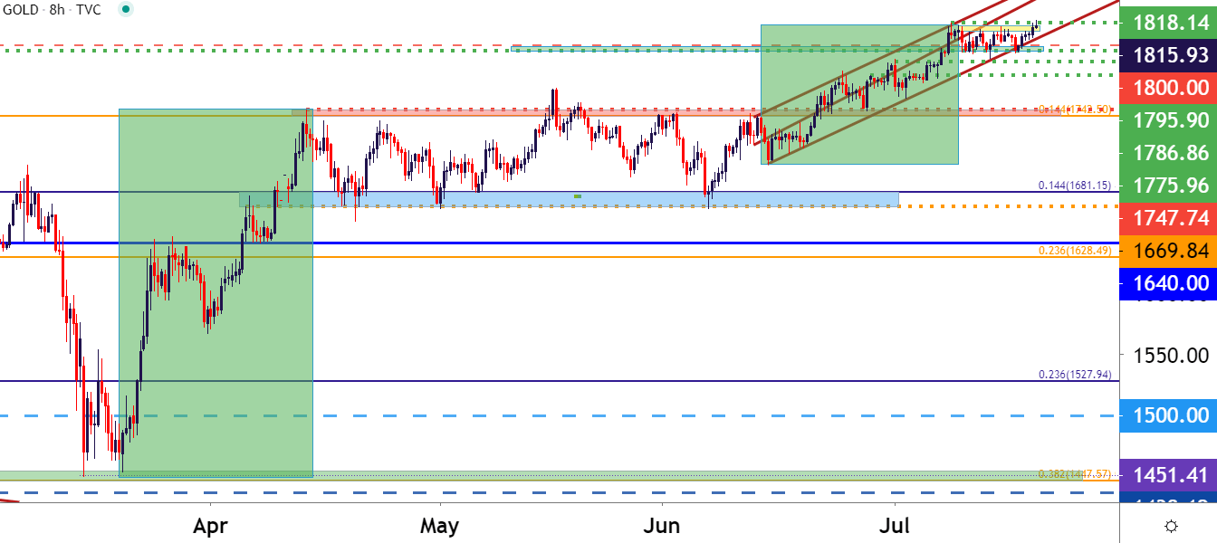 回顾金价自3月低点以来的走势,到目前为止存在两波主要上行趋势(见下图绿色区域)。第一波涨势从3月低点到4月中旬高点,此后金价开始长达两个月的区间整理。第二波涨势出现在金价突破4月到6月的区间后,这波涨势延续至7月初并最终突破1800一线创下8年以来的新高。