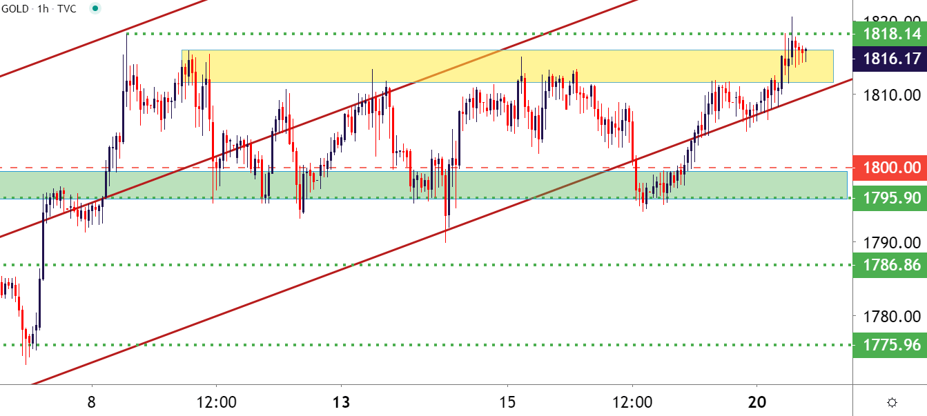 本周伊始,金价大涨突破了前几周阻碍其上行的多重阻力,创下8年以来的新高。上周这一多重阻力区域(从前高1796一线到心理关口1800一线)曾发挥支撑作用。整体而言,金价在一波上涨之后,该支撑/阻力区域成为限制金价短期走势的交易区间。