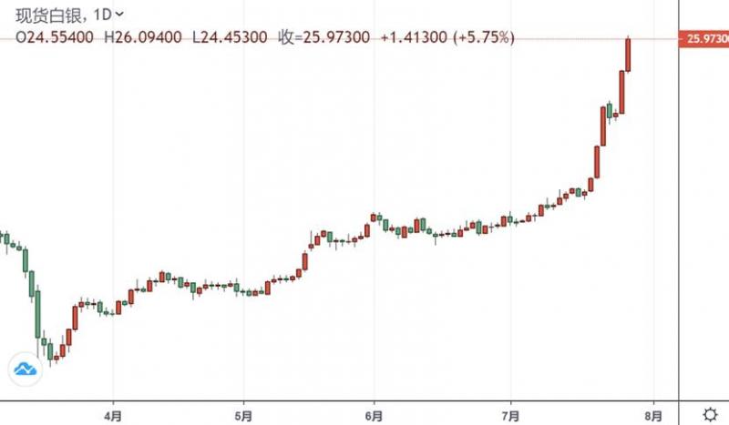 在黄金爆发之际,白银也持续拉升,一举站上26美元/盎司关口,刷新2013年4月以来新高。