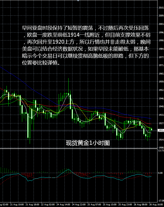 从现货黄金4小时图看,金价昨日幅度不算太大,保持震荡回落的格局,不过暂时也未能破低延续趋势,日内下方的1910-1915区间是重要的支撑位置,如果后市失守,可能会引发空头的力度加大,现阶段短期均线组小幅向下施压,不过MACD指标已经出现钝化,表明短期还是有可能继续保持震荡修正的节奏。