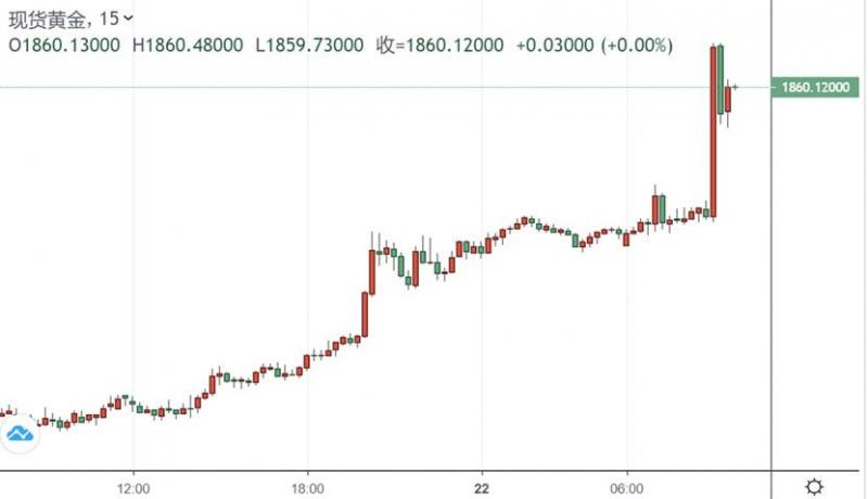在白银开启疯狂模式后,黄金紧随其后,在昨日大涨超20美元后,周三亚盘,金价短线持续飙升,接连突破关键的1850以及1860两大关口,最高触及1866美元,在短短几分钟内暴涨超20美元。目前回落至1860附近。