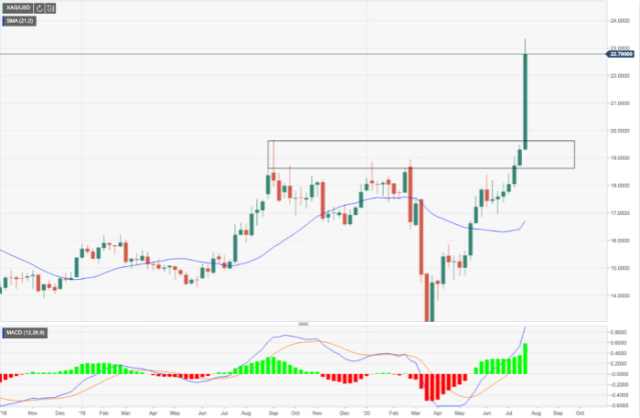 而早在7月16日,Sprott为其物理白银信托(PSLV)提交了一份简短的招股说明书。该文件使Sprott筹集了高达15亿美元的资金,这些资金将直接用于购买银条(不包括费用)。以周三的收盘价计算,约合6500万盎司白银。而在2019年,全球白银总产量为8.365亿盎司。所以Sprott的备案(如果得到完全认购)相当于每年全球产量的8%。这是一个影响市场动向的重要事件。自申请以来,白银涨幅超过15%。