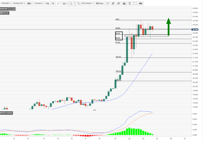 从短期的技术面来看,白银正在极端上涨的同时,进行一定盘整。从每小时走势图中可以看出,动量发散且不断测试上涨的趋势线,显示出利空信号。但月线图和4小时线图提供了看涨前景。4小时图显示多头在50%的斐波那契回撤位找到了新的支撑。