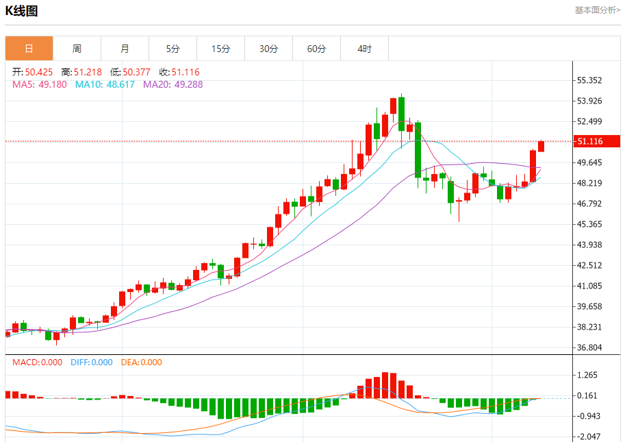 周二盘中,现货白银报51.113,涨幅1.25%。