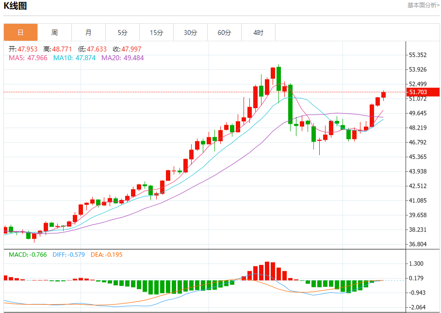 周三盘中,现货白银报51.703,涨幅1.00%。