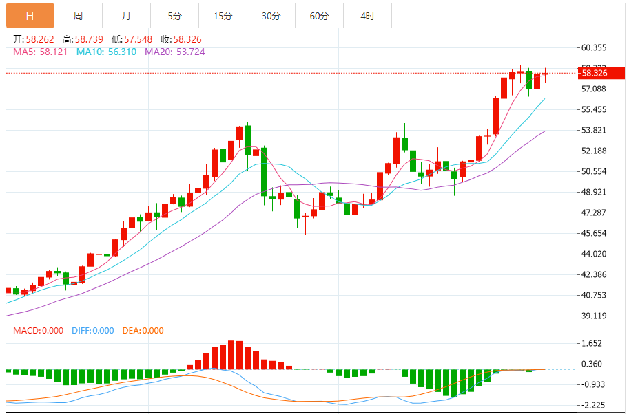 白银仍位于上升的200小时指数移动平均线56.30美元上方,支撑了更广泛的偏向。移动平均线收敛背离(MACD)转为负值,跌破零线,下行动能增强。RSI在50.82处于中性状态,预示多头动能降温。
