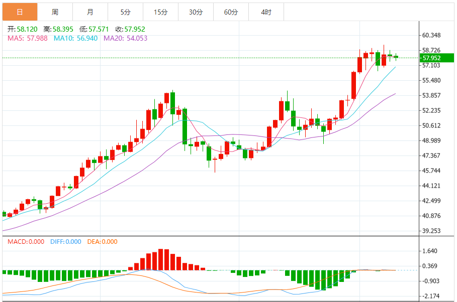 白银在56.58至59.34美元之间徘徊,持续一周多。20日指数移动平均线(EMA)正在上升,支撑了上涨,目前为54.73美元,价格稳稳守在上方。