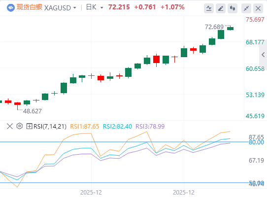 日线图中,白银报72.21美元。20日指数移动平均线正在上升,价格稳稳守在上方,强化了坚定的多头倾向。平均值的正斜率继续支持这一上涨。RSI(14)在80.95被超买,显示动能被拉长,可能在盘整前出现。