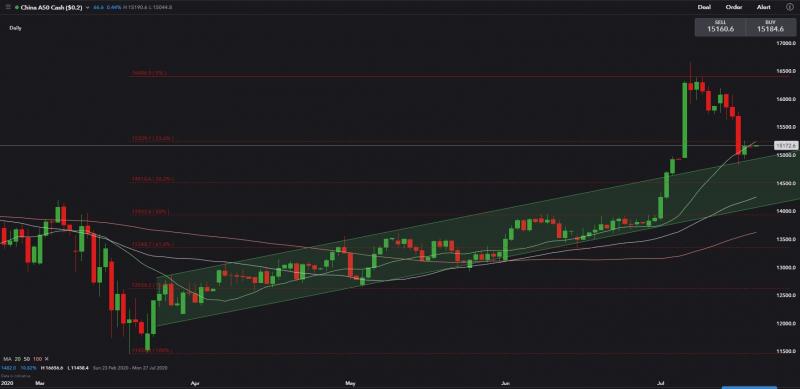 从技术角度而言,富时中国A50指数测试了15000一线支撑,并成功持稳于该水平上方。而且,15000一线还是该指数自3月底到7月初形成的上升通道的上边界,因此目前成为了一个重要支撑。然而,上周四形成的长期看跌指标可能引发一波短线抛售压力。