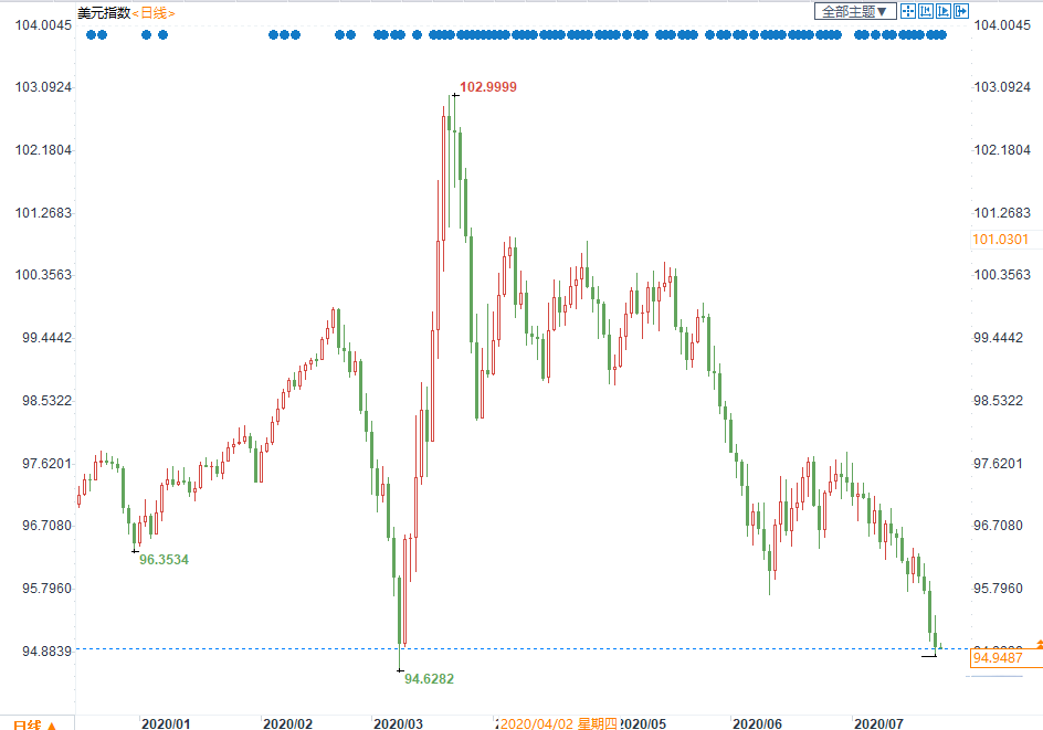 周三美元指数盘尾下跌0.22%至94.97,盘中一度低见3月以来最低94.8257。Merk Investments总裁兼首席投资官Axel Merk表示,“这是全球再通胀的一部分,或许持续多年的美元牛市已经结束。美元疲软,关键原因是美国的实际利率偏低,且承诺会进一步走低。