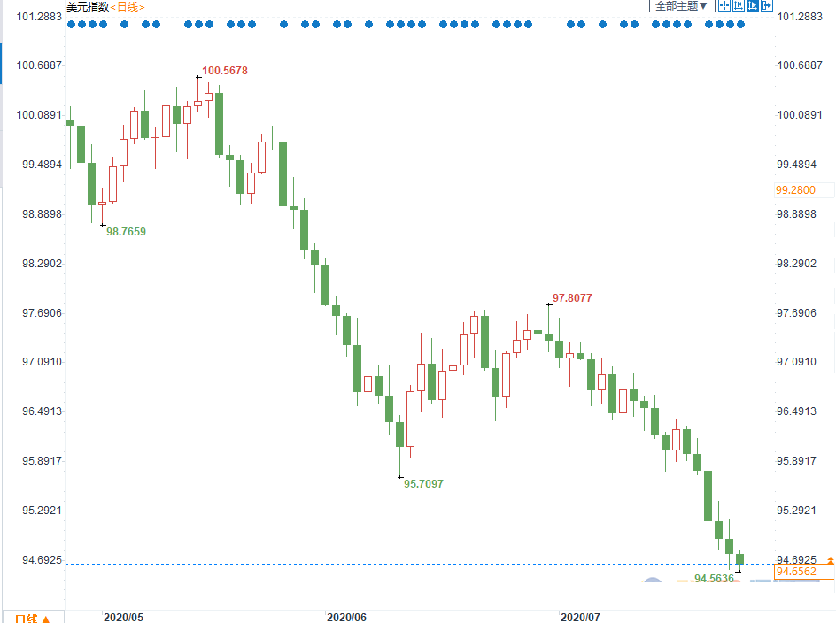 美元跌至近两年低点,因投资者预期病例激增将使美国经济复苏难以跑赢其他国家,继续抛售美元。