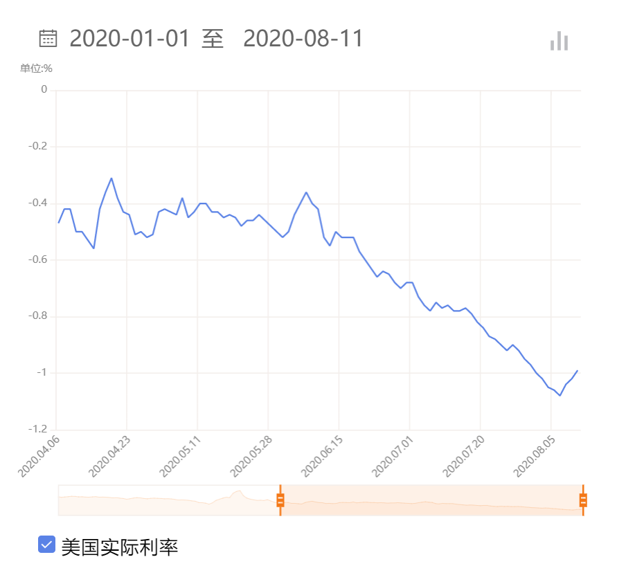 现货金银大跌的原因,金十在昨晚的报道中已经提过,其触发因素是债券收益率急剧上升,这导致了部分获利回吐,然后跌势进一步扩大。实际利率走高也是导致黄金价格大跌的原因,美国PPI数据良好,给市场又一个重新评估利率和预期的理由。8月11日,美国财政部发布的美国10年期国债实际利率为-0.99%,较前一天日回升0.03个百分点。