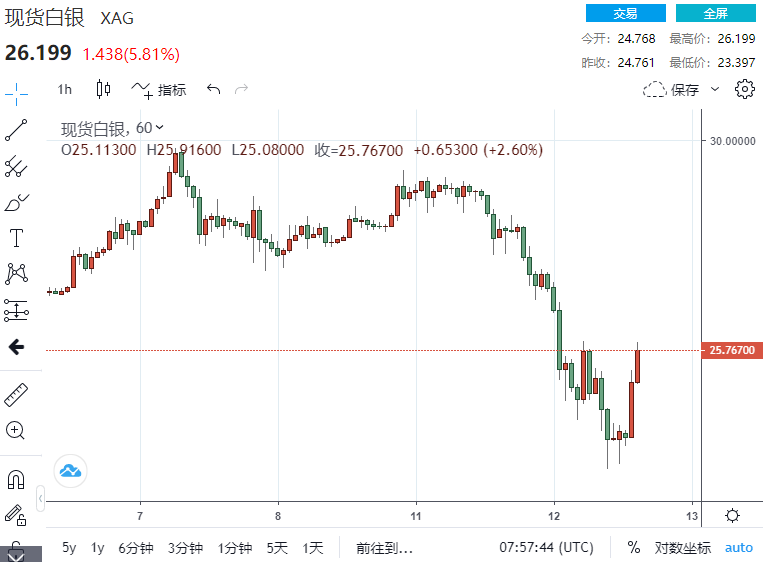 在黄金暴涨暴跌之际,白银的走势更为剧烈:周二暴跌15%,创下雷曼危机以来最大单日跌幅;周三一度也是大跌5%,随后开始强势反转,最高升至26.090美元/盎司,涨超5%,单日振幅超过10%