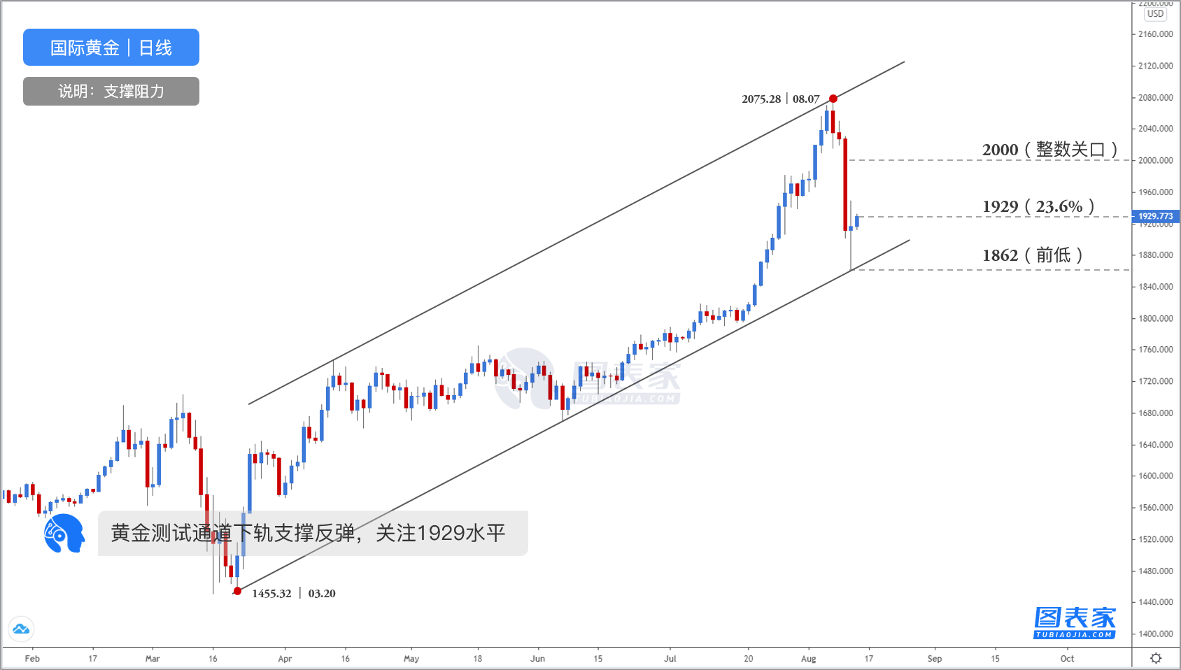 黄金守住通道下轨支撑,若价格突破1949则见1969水平。