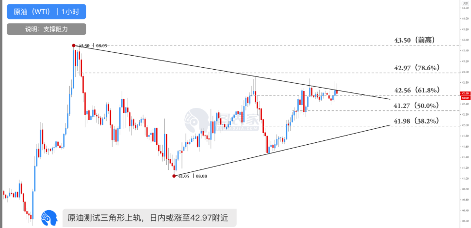 图为原油1小时走势图,油价短线走高,目前正测试斐波那契61.8%回调位42.56与三角形上轨阻力,突破后短线看涨至斐波那契78.6%回调位42.97附近,后市或将进一步测试前高43.50附近阻力。