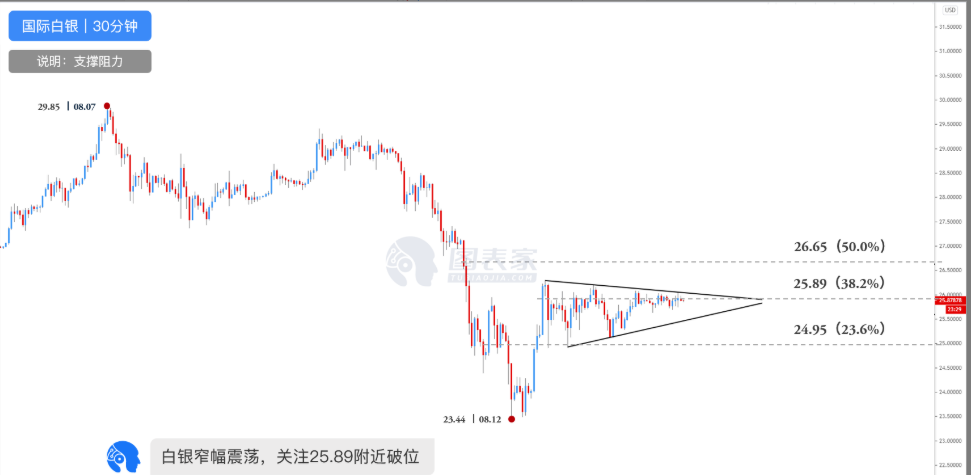若银价受阻回落,下方较近支撑位为三角形下轨,跌破后或将进一步看跌至斐波那契23.6%回调位24.95.