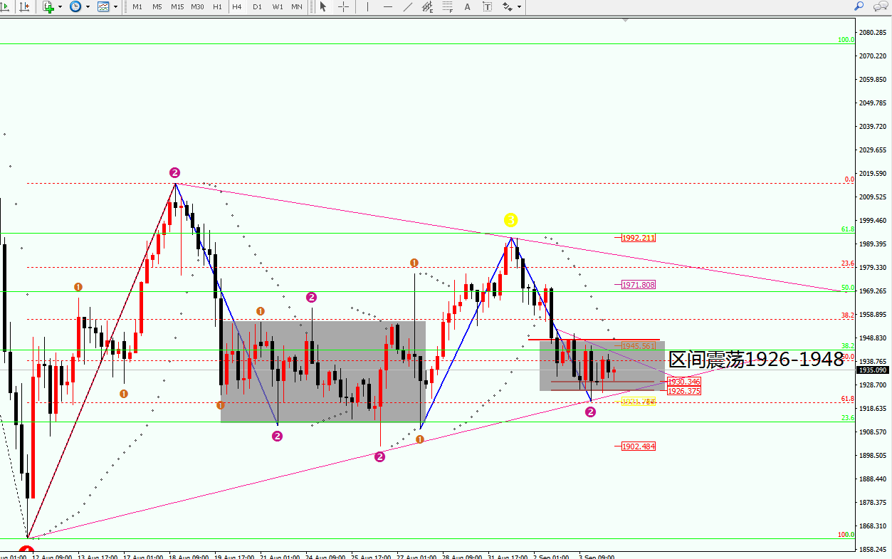 从本周的走势看,价格跌破1950之后,没有一次站稳该点。所以该位置是目前比较强的压制位,也就是均线MA60的横盘线,目前位于1946一线。