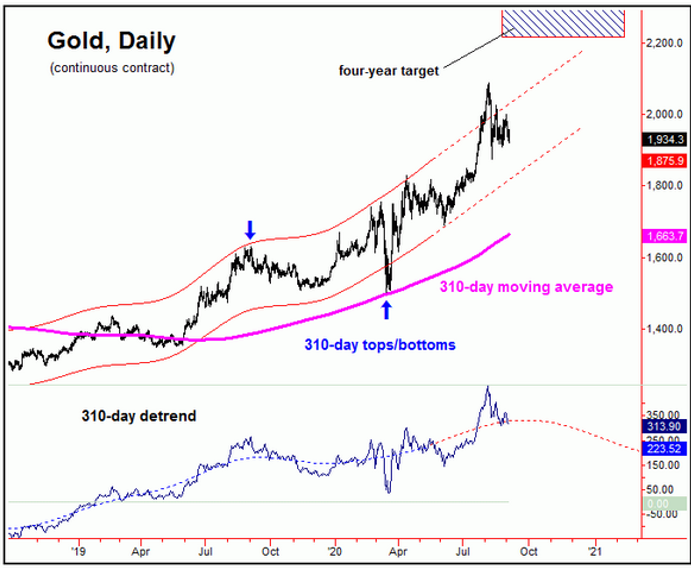 中期格局上,从2089开始的调整属于第四浪调整,市场还有空间进行最后一波的上攻。在310天周期上,黄金的行情预计将至少延续至10月末。考虑到在牛市行情中,价格通常比预期更高,因此未来1-2个月震荡上行的可能性较大。