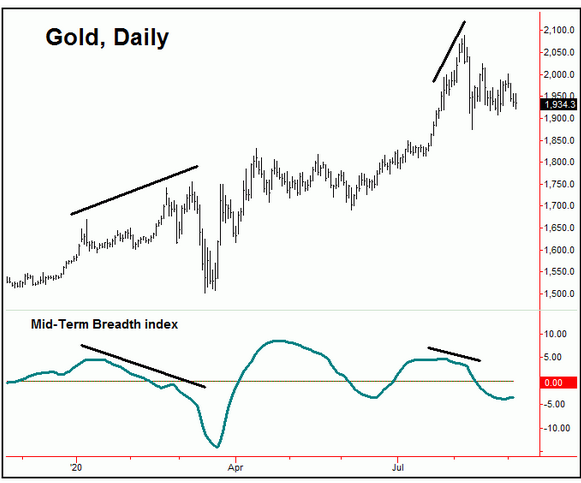 在此前几周的文章中,我们预计中期走势依然上行,但会存在多次调整。最近一次的调整周期出现在34天上,如下图所示。这一周期上,下行将延续至8月末及九月初,此前创下的低位1874很有可能已经是低点,但还需要进一步的确认。