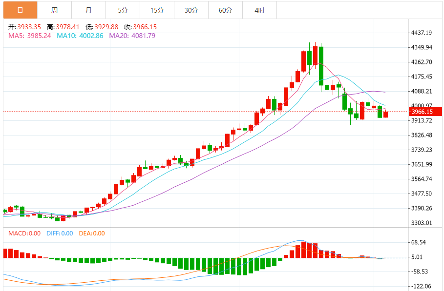 周二(11月4日)纽约尾盘,现货黄金跌1.73%,报3932.8美元/盎司,亚太盘初微幅上涨至4006.48美元之后,至北京时间21:23都持稳于3989美元一线,22:29出现一波显著的加速下跌行情,22:42刷新日低至3928.98美元。COMEX黄金期货跌1.84%,报3940.30美元/盎司。