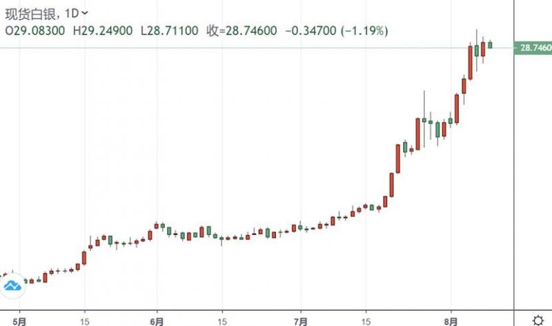 在黄金加速下行之际,白银也上演跳水行情,银价在昨日大涨3%后未能站稳脚跟,亚市盘中持续走低,迅速跌超1%失守关键的29美元支撑,最低触及28.73附近。
