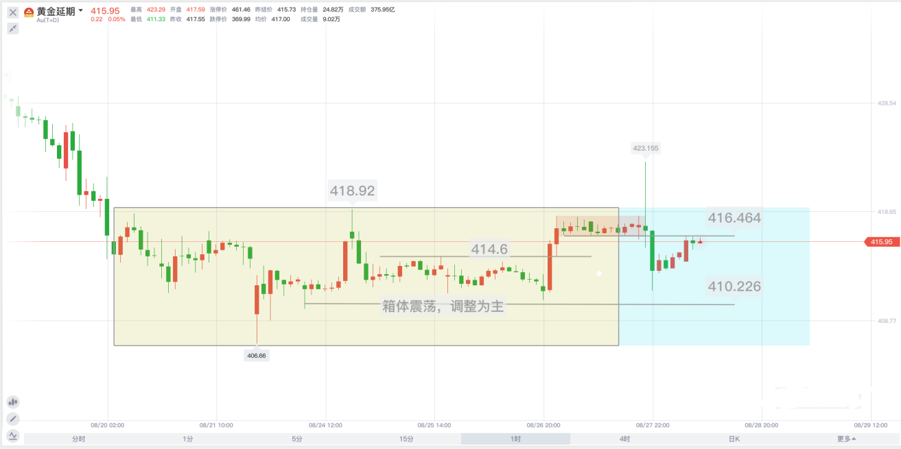参考国际黄金走势,受鲍威尔讲话影响,黄金TD价格一度上破箱体震荡区域,随后又快速下探,日内开盘黄金逐渐收复跌幅,价格回归到昨日剧烈波动前的416元附近。黄金TD维持盘整状态,昨日金价窄幅震荡区域底部(图中红色区域),在416.5元附近正初步形成压力位,下方支撑关注410元附近,其中414.6元附近,可能形成短期支撑。