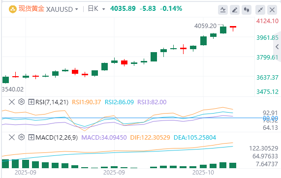 10月9日,黄金在周四欧洲时段上半段仍处于不利地位,尽管在好坏参半的基本面信号下,黄金仍设法守住4000美元心理关口上方。以色列与哈马斯就和平协议的第一阶段达成协议有助于缓解一些地缘政治紧张局势,并在仍处于超买状态的情况下促使围绕避险贵金属获利了结。此外,美元在每周上涨趋势的基础上攀升至8月初以来的最高水平,这被证明是削弱该商品的另一个因素。